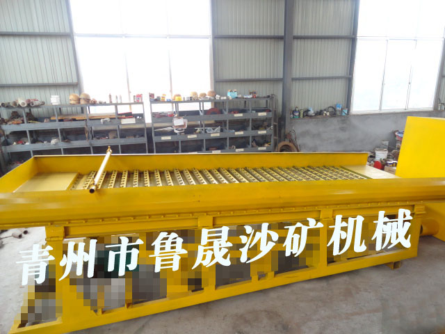 它的工作原理是上下鼓動,底部有硅膠板。硅膠板上部有隔水槽用于分流進水和富集黃金。鼓動溜槽通過上下鼓動將輕重礦物分離,輕的沙子通過上下鼓動的水流帶走排出為尾礦,精礦比重高會留在被隔水槽留住,留在隔水槽的底部。這種溜槽因為發(fā)明的時間早,知道此設備的人多,所以用的比較多。但是這個設備的弊端也非常的明顯,因為它只能回收大顆粒的黃金,細顆粒的毛細金、片金、微粒金都會隨水跑掉的。